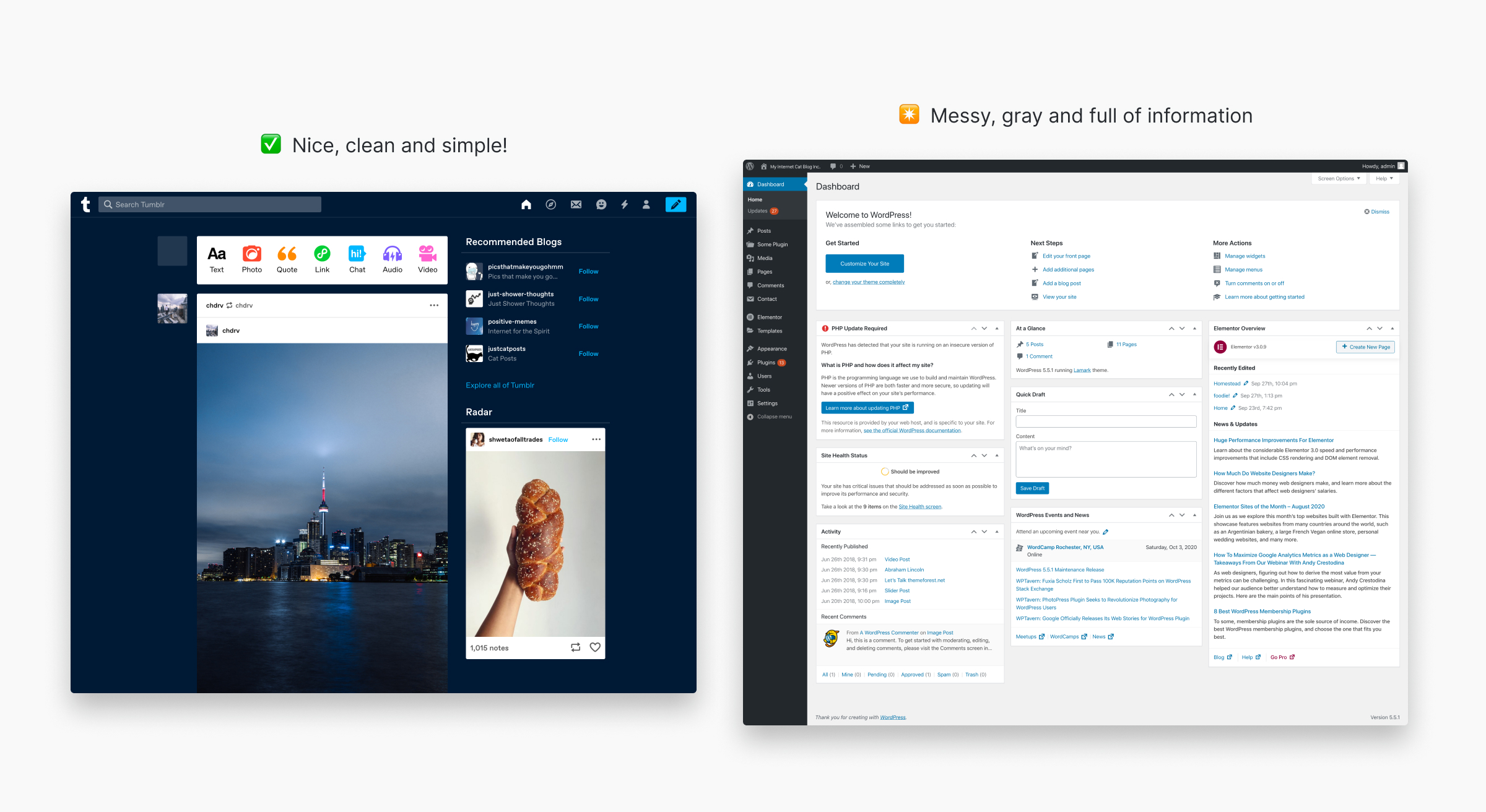 I remember opening WordPress for the first time back in the day. Coming from much more user-friendly platforms like Tumblr, WordPress appeared a bit overwhelming at first. All those notifications, buttons, links, dashboard widgets were a bit much.