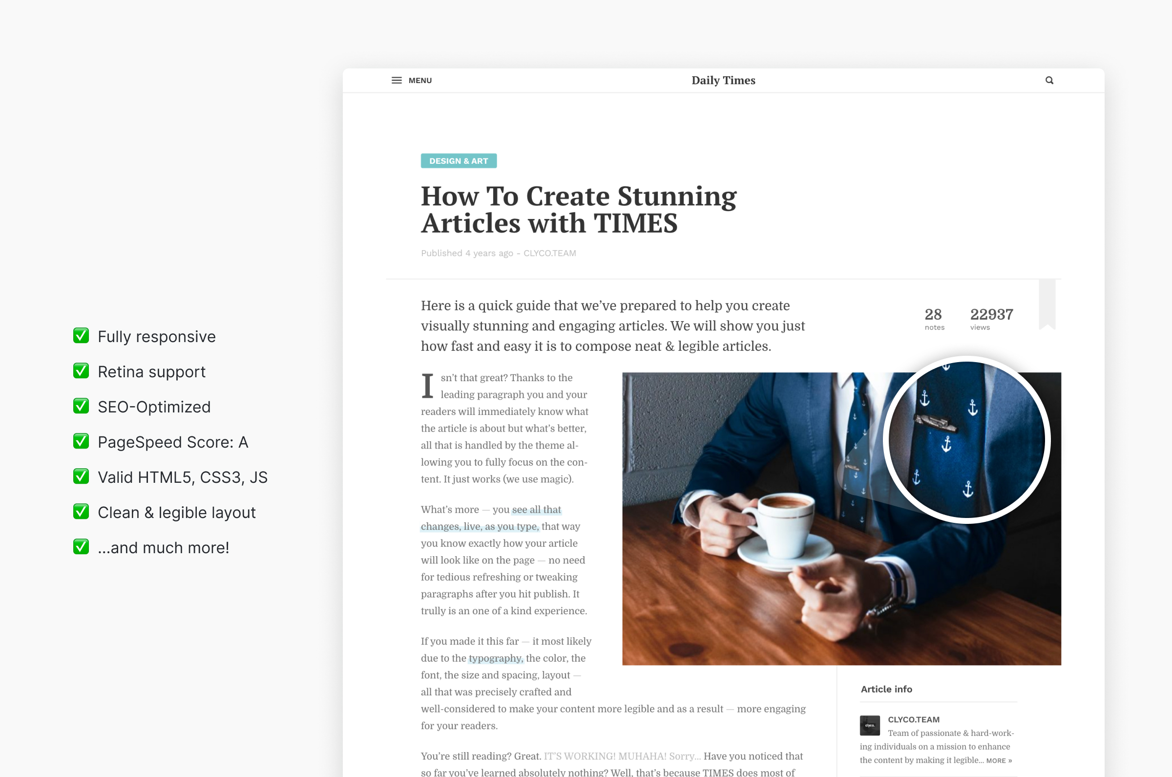 Powerful, simple & intuitive WordPress theme designed for content publishers. Designed to redefine UX by making content both easier to create and consume.