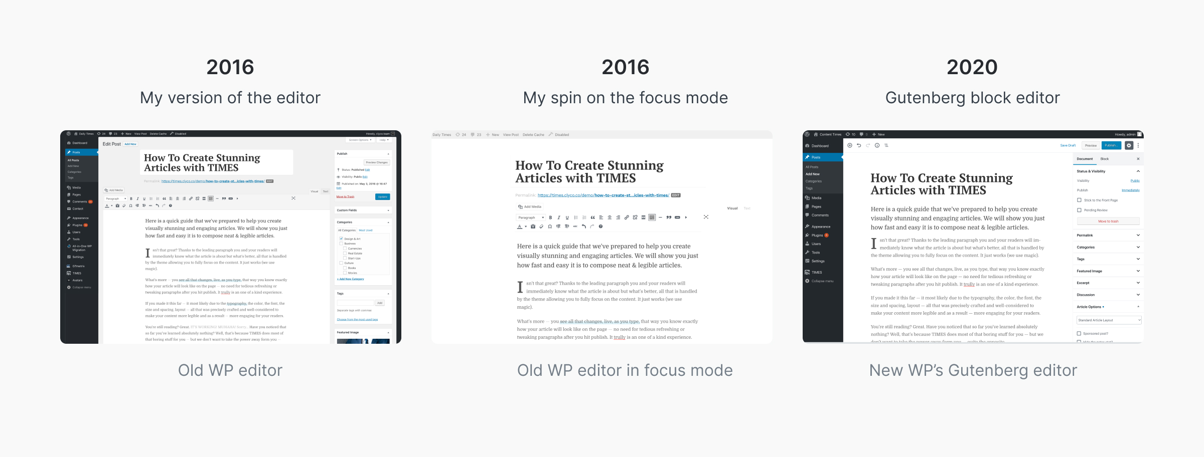 All those features ultimately won’t matter if the process of adding your content is inadequate. Luckily the new addition of Gutenberg adresses a lot of concerns regarding content creation. It’s now recommened to have your post editor look as closely as the end article that will be published on your site. But back in 2016, when I started the development of the theme, this idea wasn’t common at all. The focus mode was also my addition. In the end, it felt really nice to have my ideas verified by the WP team.
