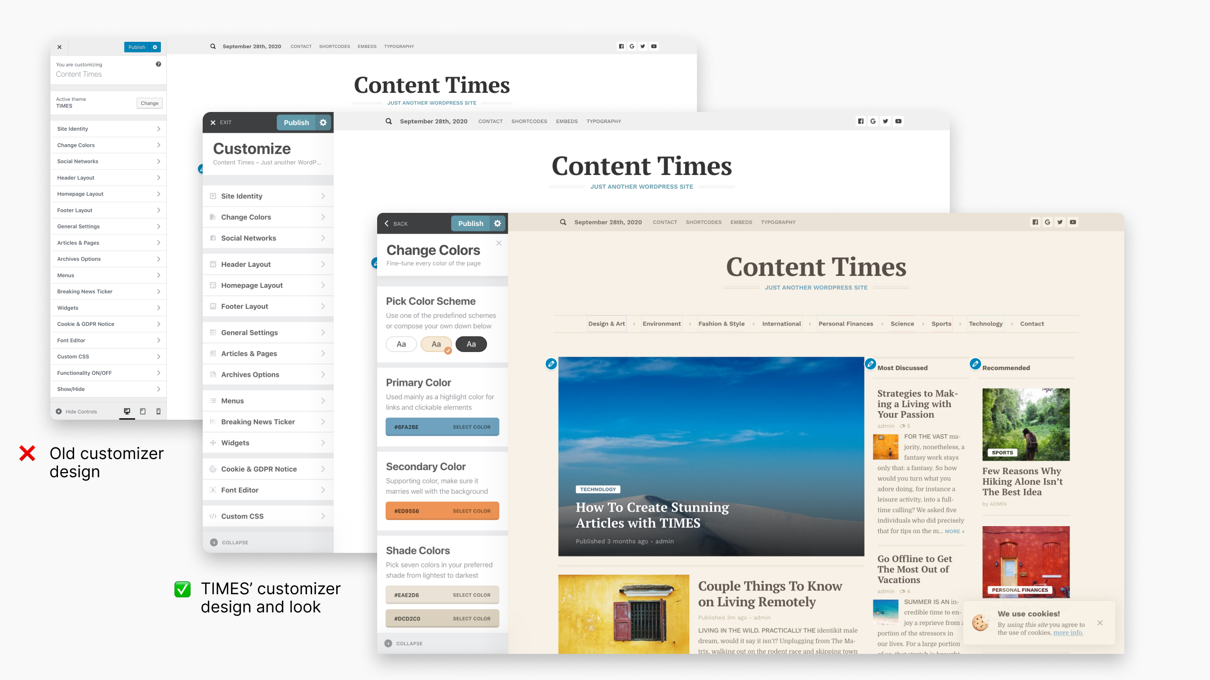 Luckily all this can be easily adjusted! The new theme customizer I made features color scheme tools, custom footer text builder, cookie notice control, improved controls and so much more.