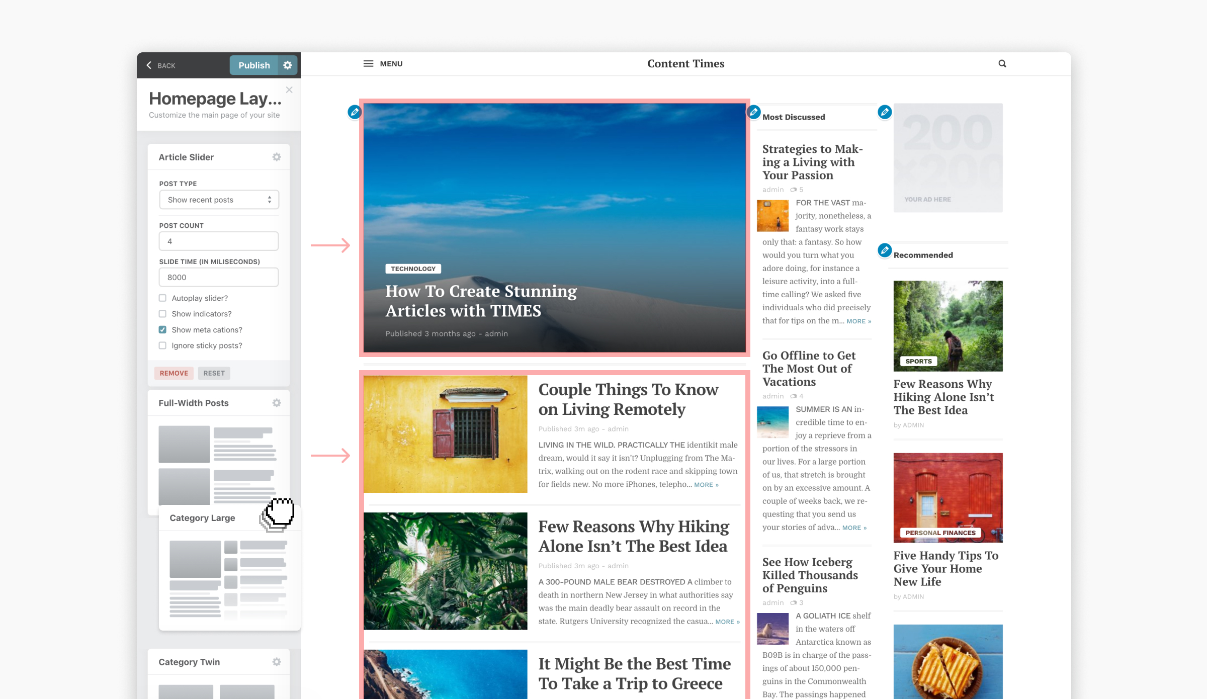 The homepage is divided into sections or modules. Each section on the homepage can have different settings as to what content it’ll show. The order of sections can be easily changed by a drag-and-drop motion in the customizer. You can see all the changes live and only the relevant sections will update with AJAX.