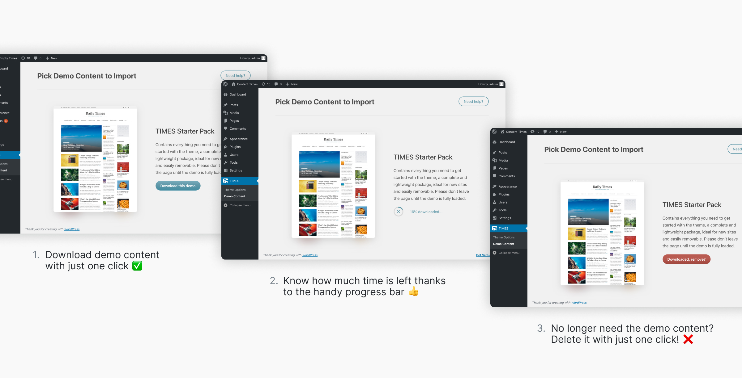 It was one of the most challenging and enjoyable features I have ever added to the theme. This demo content downloader is also designed to be unobtrusive — it will only attempt to add demo posts, menus and widgets but it will do so without wiping your whole site clean.